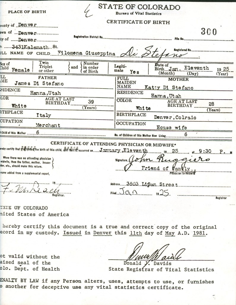 Sis was born in Denver, Adams, Colorado. Her parents had traveled there by train to retrieve her paternal grandmother, Maria Filomeno, from jail. (That’s another story.) After a short stay in Denver, Sis and her parents returned home to Tabiona, Duchesne, Utah to welcoming brothers.