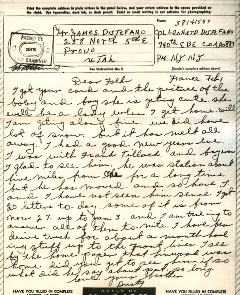 Leonard served in World War II in the European Theater. In 1945, he was in France.