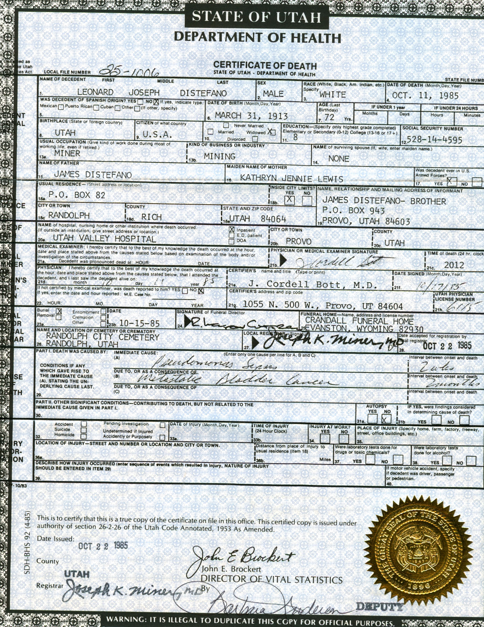 Leonard Joseph DiStefano was the first child born to Girolamo DiStefano and his wife Katherine Jennie Luisi. He arrived on 31 March 1913 in Magna, Salt Lake, Utah.
